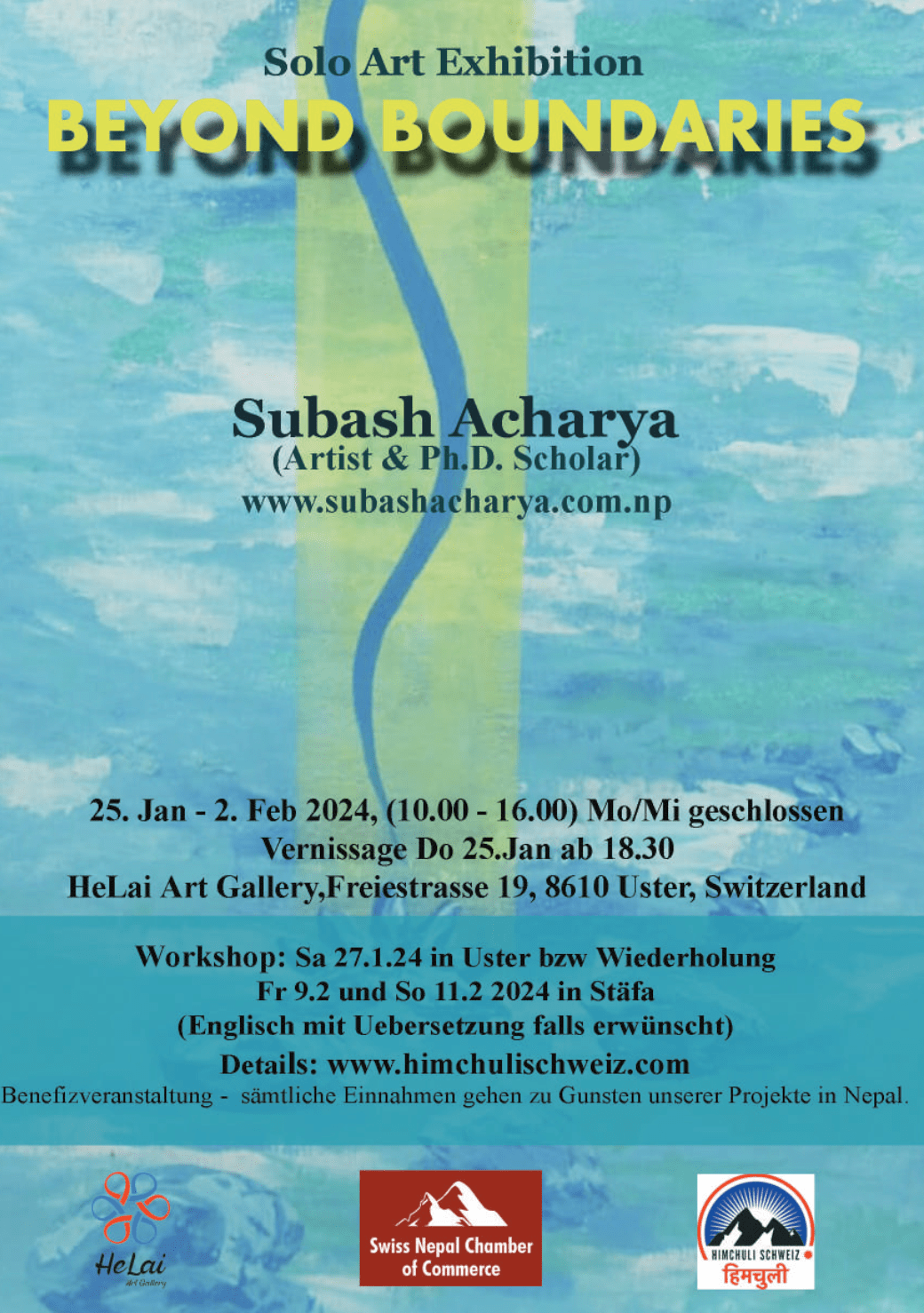 Oben seht Ihr die Einladung zu seiner Ausstellung „ Beyond Boundaries‟ ( „jenseits von Grenzen‟) in Uster. Am Do 25. Jan. 2024 findet die Vernissage mit nepalesischer Musik und Apero riche statt.
