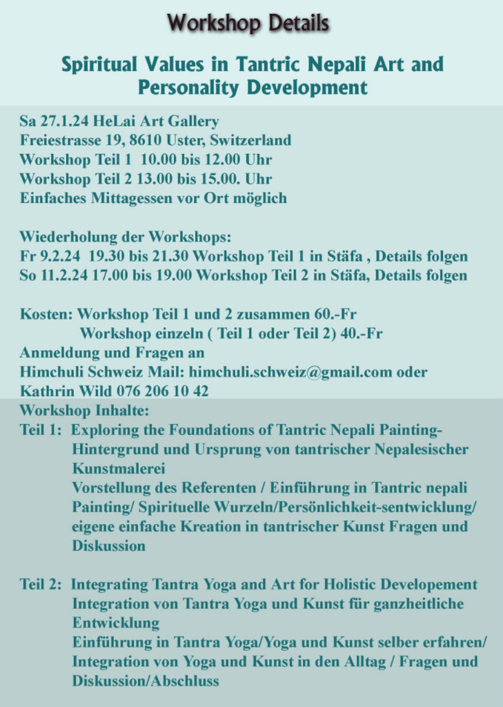 In zusätzlichen Workshops (Details unten) erfahren wir mehr über sein PhD Thema „Spiritual Values in tantric nepali art and personality developement‟ („spirituelle Werte in tantrischer nepalesischer Kunst und in der Persönlichkeitsentwicklung‟ ). In seiner modernen Malerei nimmt er ebenfalls Bezug auf diese traditionellen Werte.